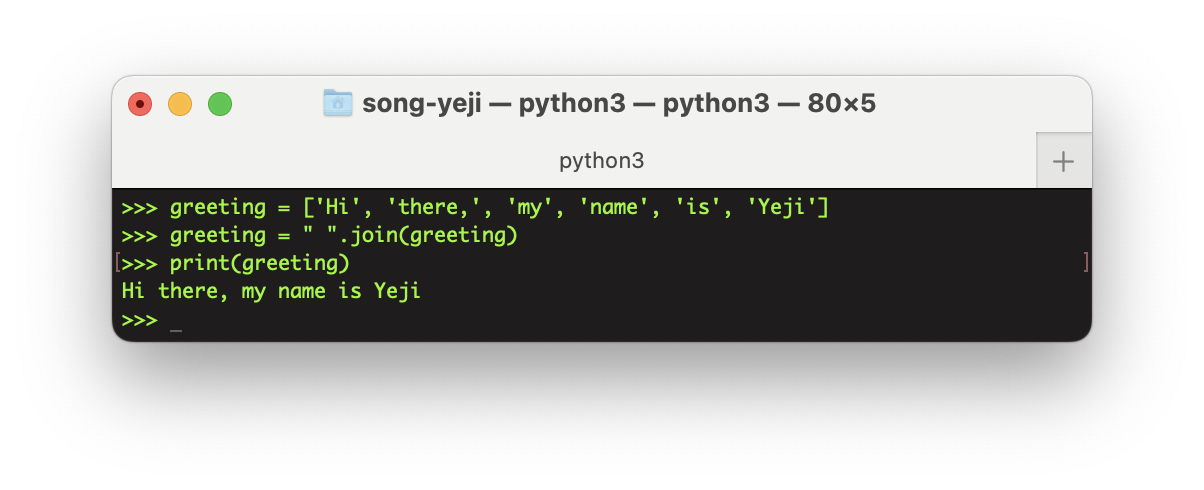 리스트로 나눠진 문자들을 한 문자열로 합칠수도 있습니다.
