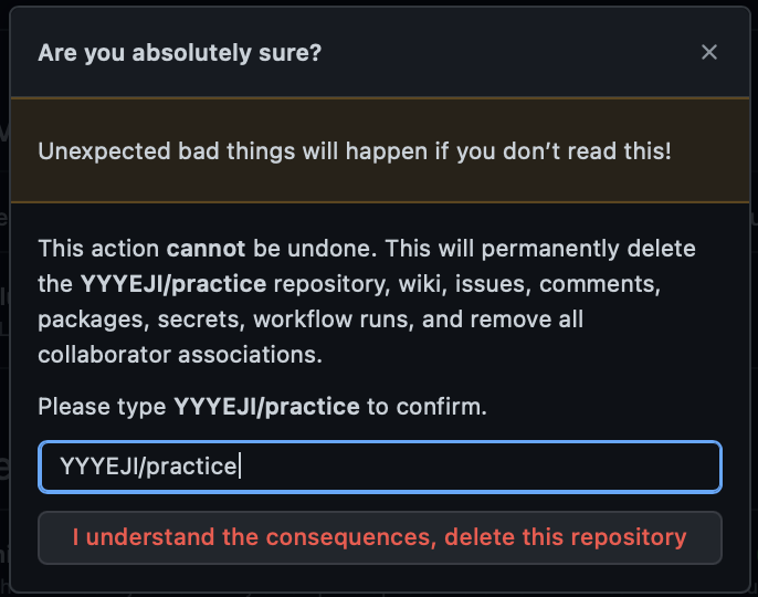 I understand the consequences, delete this repository를 클릭해주시면 repo가 삭제됩니다!