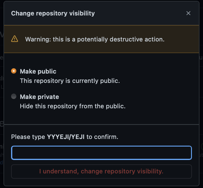 I understand, change repository visibility를 눌러주시면 repo의 공개 여부가 바뀝니다.