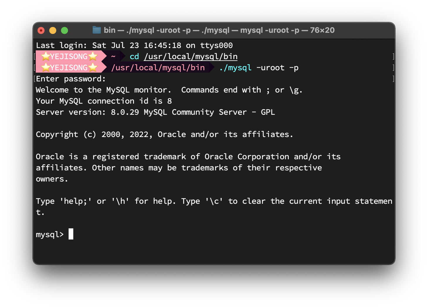 아래 코드를 입력하고 비밀번호 입력하면 mysql 로그인 완료 !