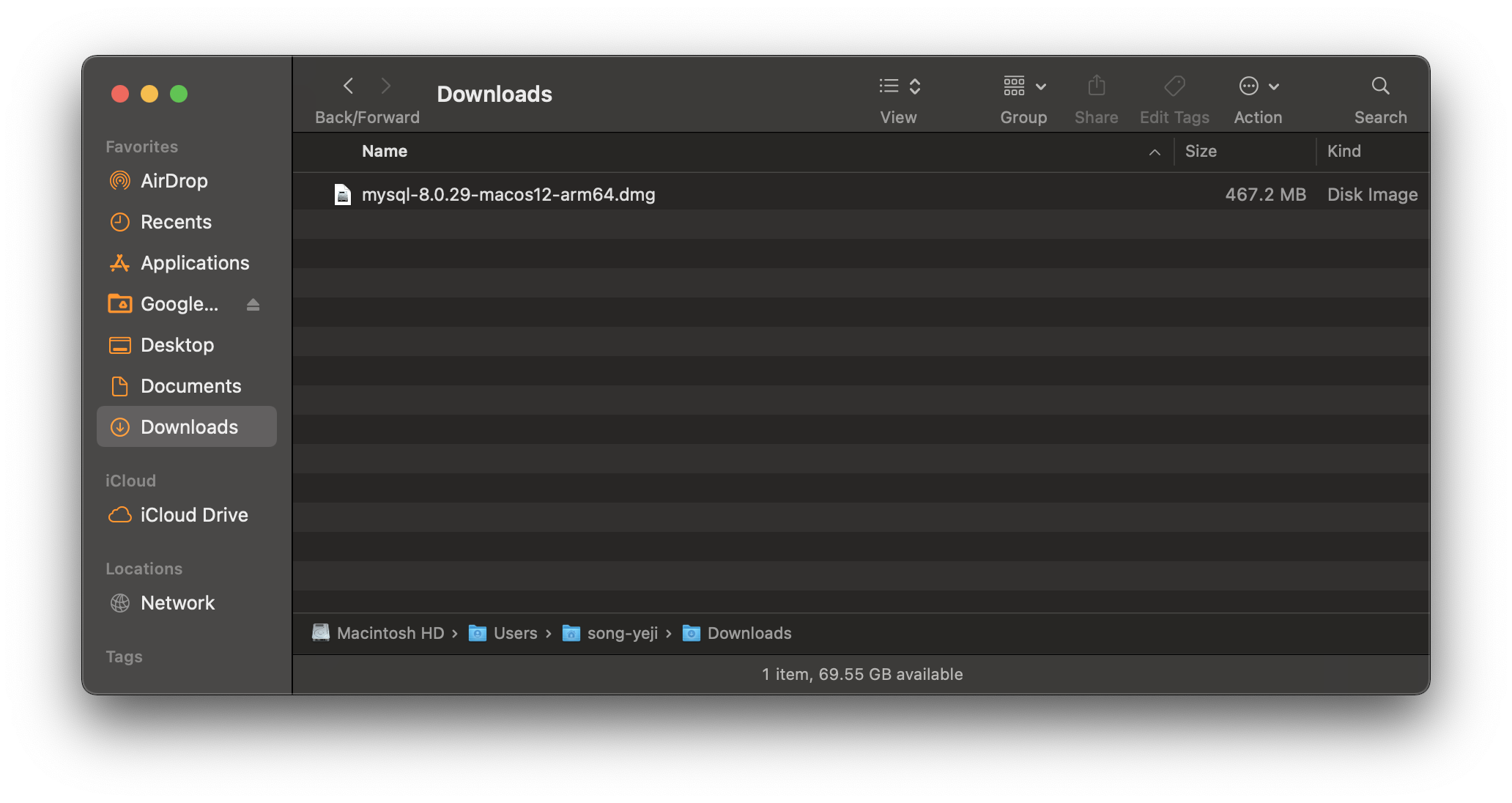 Finder -> Downloads 에 있는 설치파일을 열어줍니다.