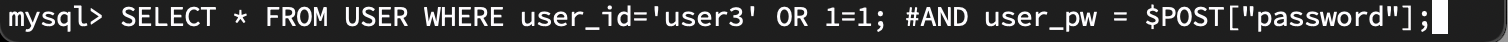 1=1 때문에 명령어가 TRUE가 되면서 전체 데이터가 조회가 됨 -> SQL injection