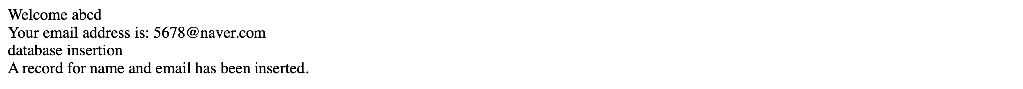 mysqli_connect의 함수가 잘 실행됐다면 TRUE가 되어 "A record for name and email has been inserted."가 출력됩니다.
