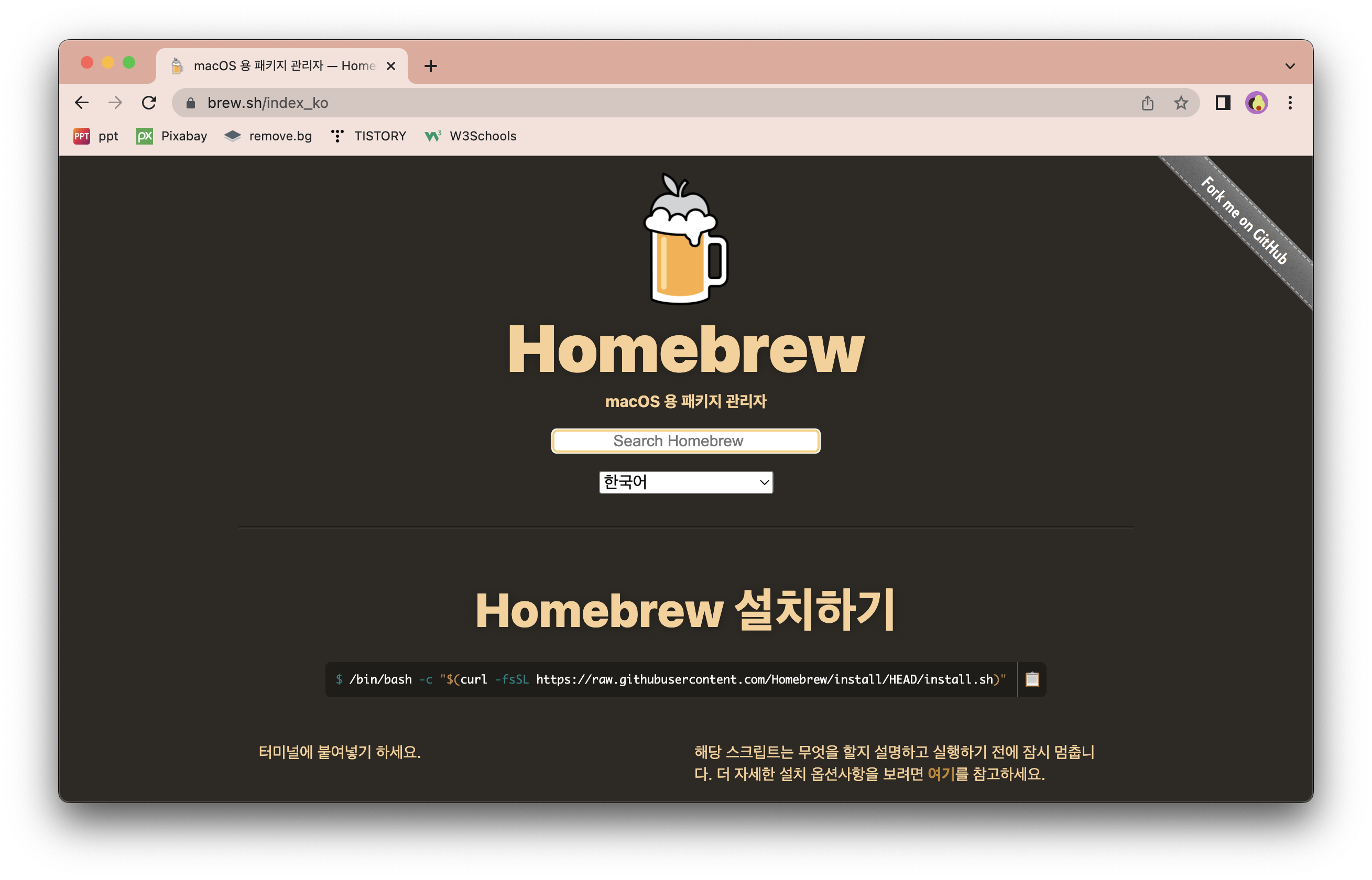 homebrew 설치하기 밑에 있는 코드를 copy해서 Terminal에 paste 해주면 됩니다.