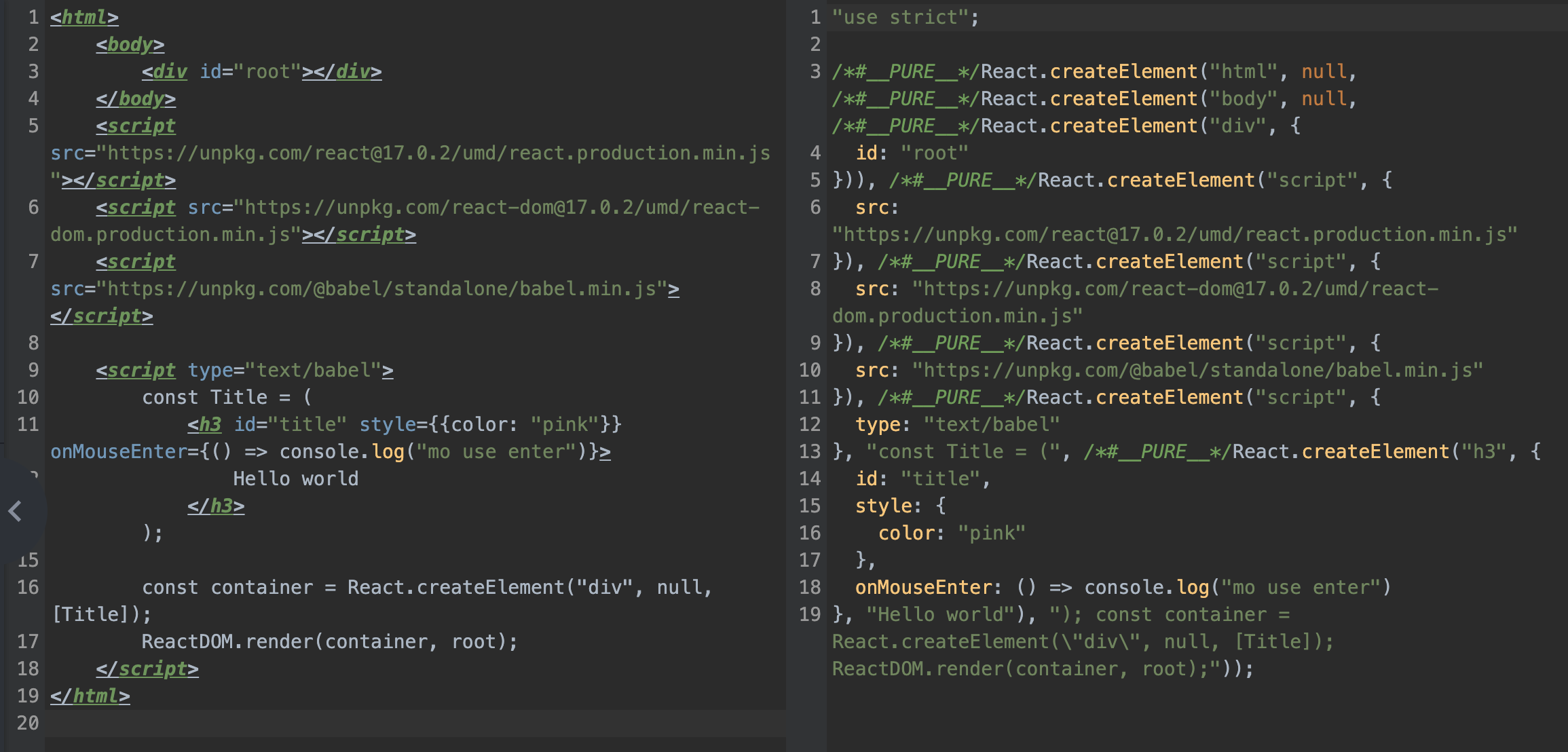 Babel은 위에 링크로 걸어두었던 페이지에서 사용한 코드로 JSX 코드를 바꿔줍니다.