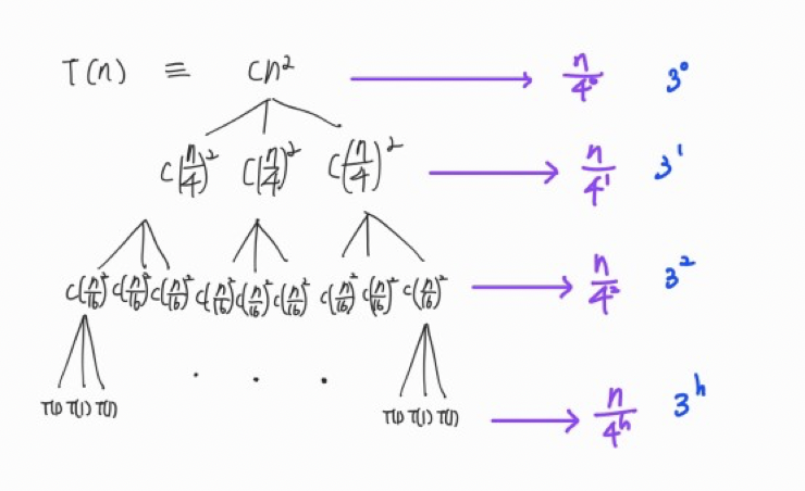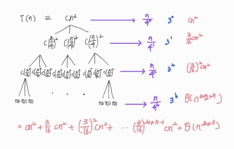 그림을 따라서 각각의 트리 레벨의 길이를 구하다보면 트리의 총 길이는 1 = n/4ʰ임을 알 수 있습니다.
