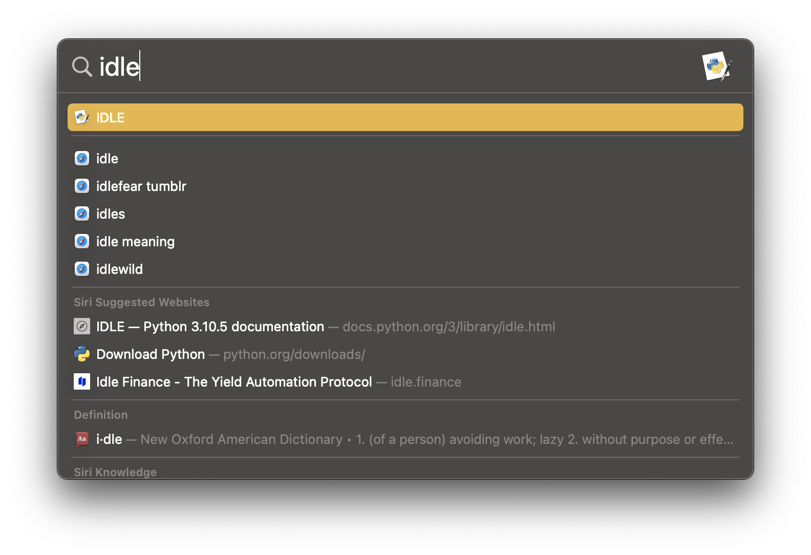 앱으로 실행시키고 싶다면 Command(⌘) + Space Bar 누르고 idle을 입력해주세요.
