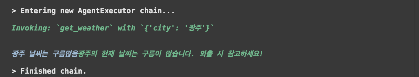 {"input": "광주 날씨 어때?"} # agent에서 '광주'와 관련된 답을 찾아 리턴