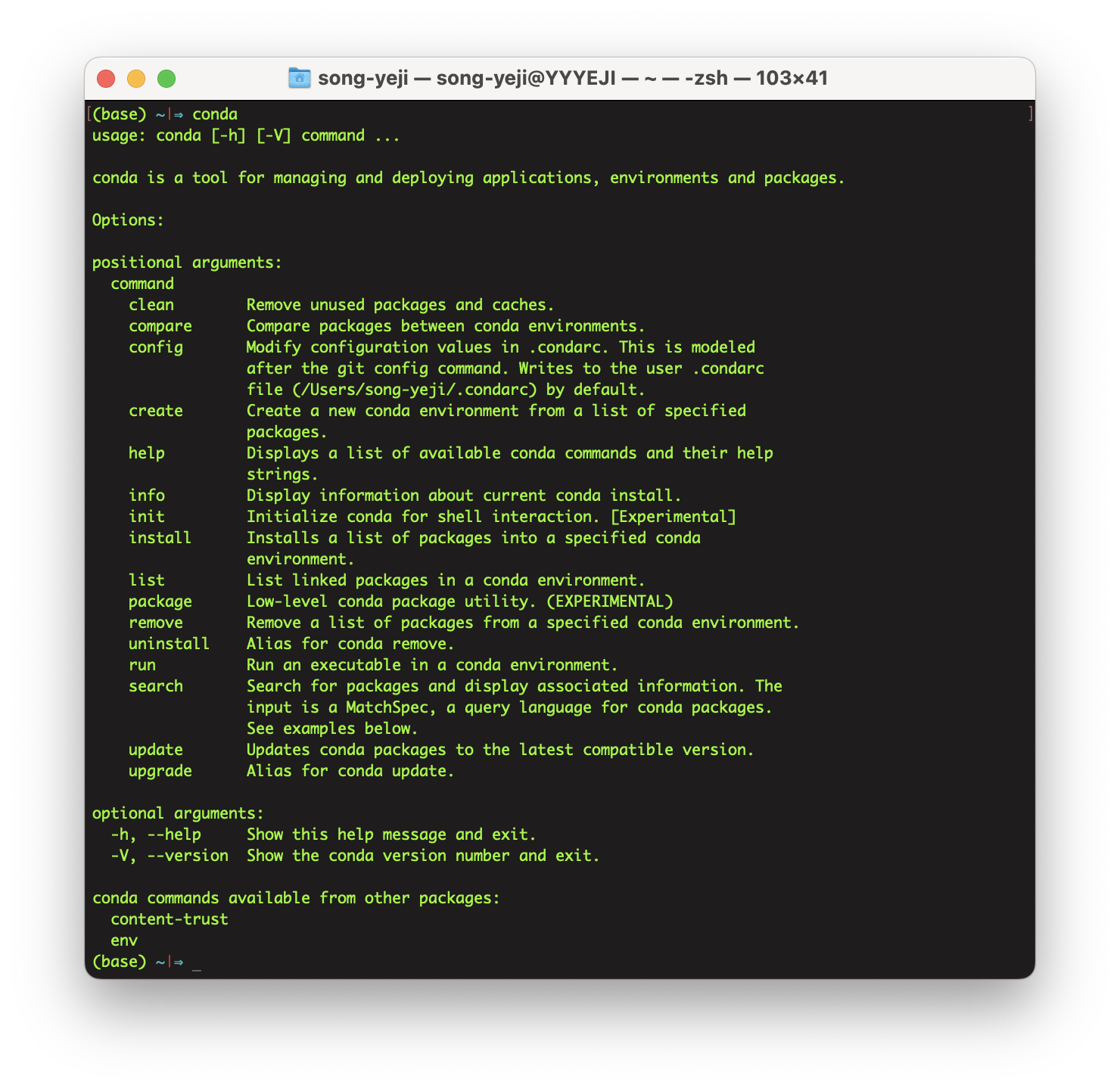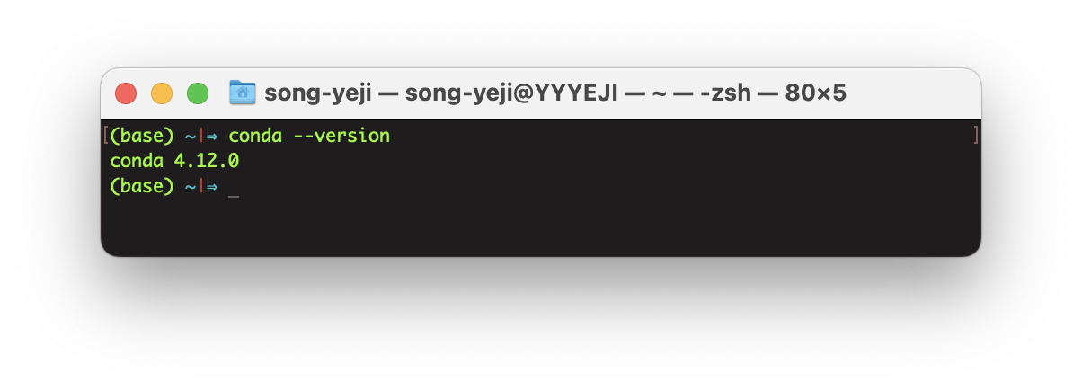 아래 명령어는 Conda가 잘 설치됐는지 확인하는 명령어입니다.