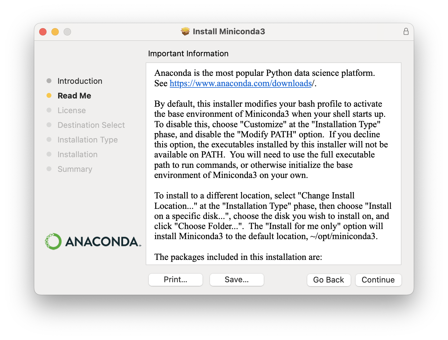Miniconda is a free minimal installer for conda. It is a small, bootstrap version of Anaconda that includes only conda, Python, the packages they depend on, and a small number of other useful packages, including pip, zlib and a few others. Use the conda in